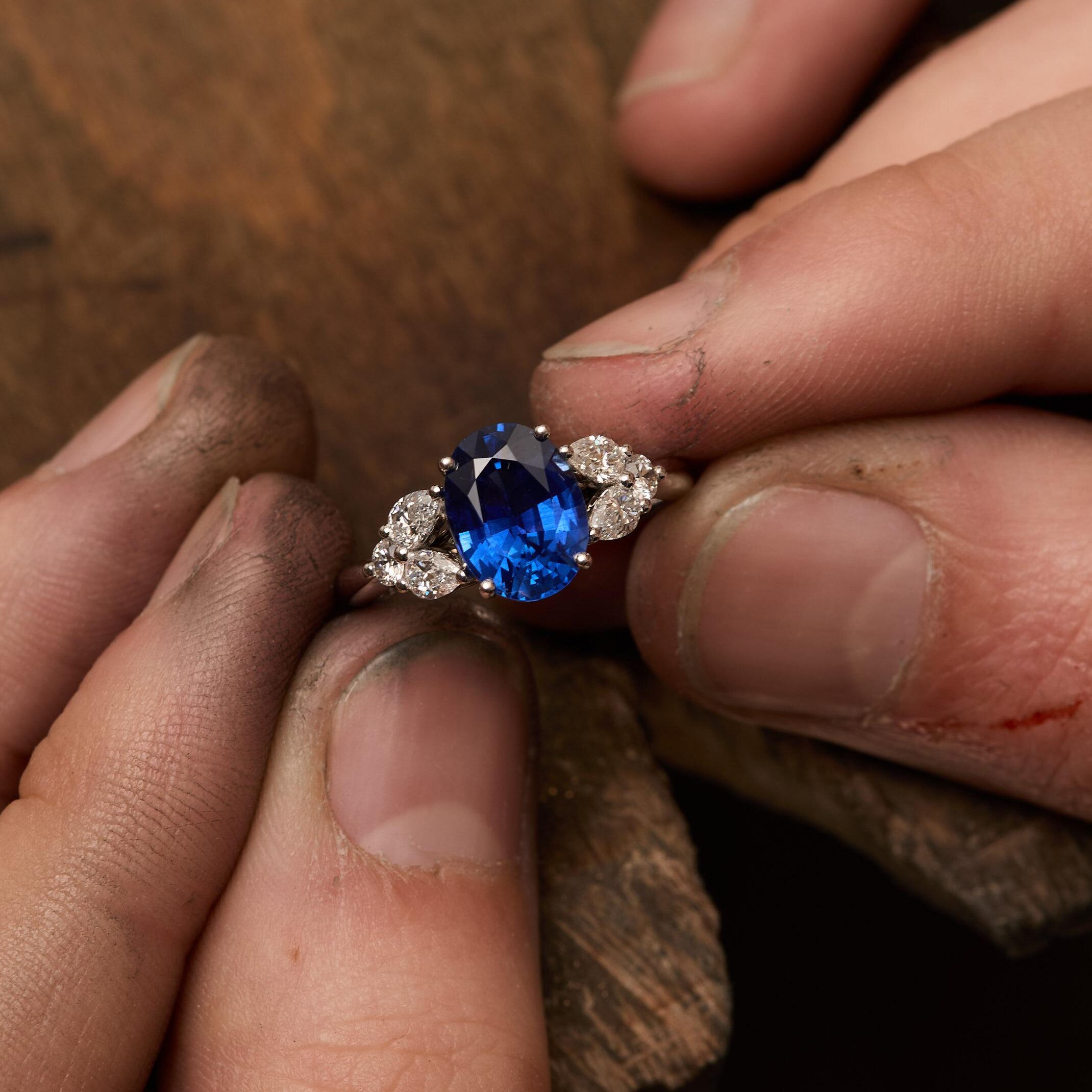 L’or blanc souligne la clarté du Saphir Peacock de 2,60 carats. Ses reflets bleus et verts s’accordent à la pureté de l’or, tandis que les diamants baguettes prolongent les lignes et structurent la bague avec élégance.