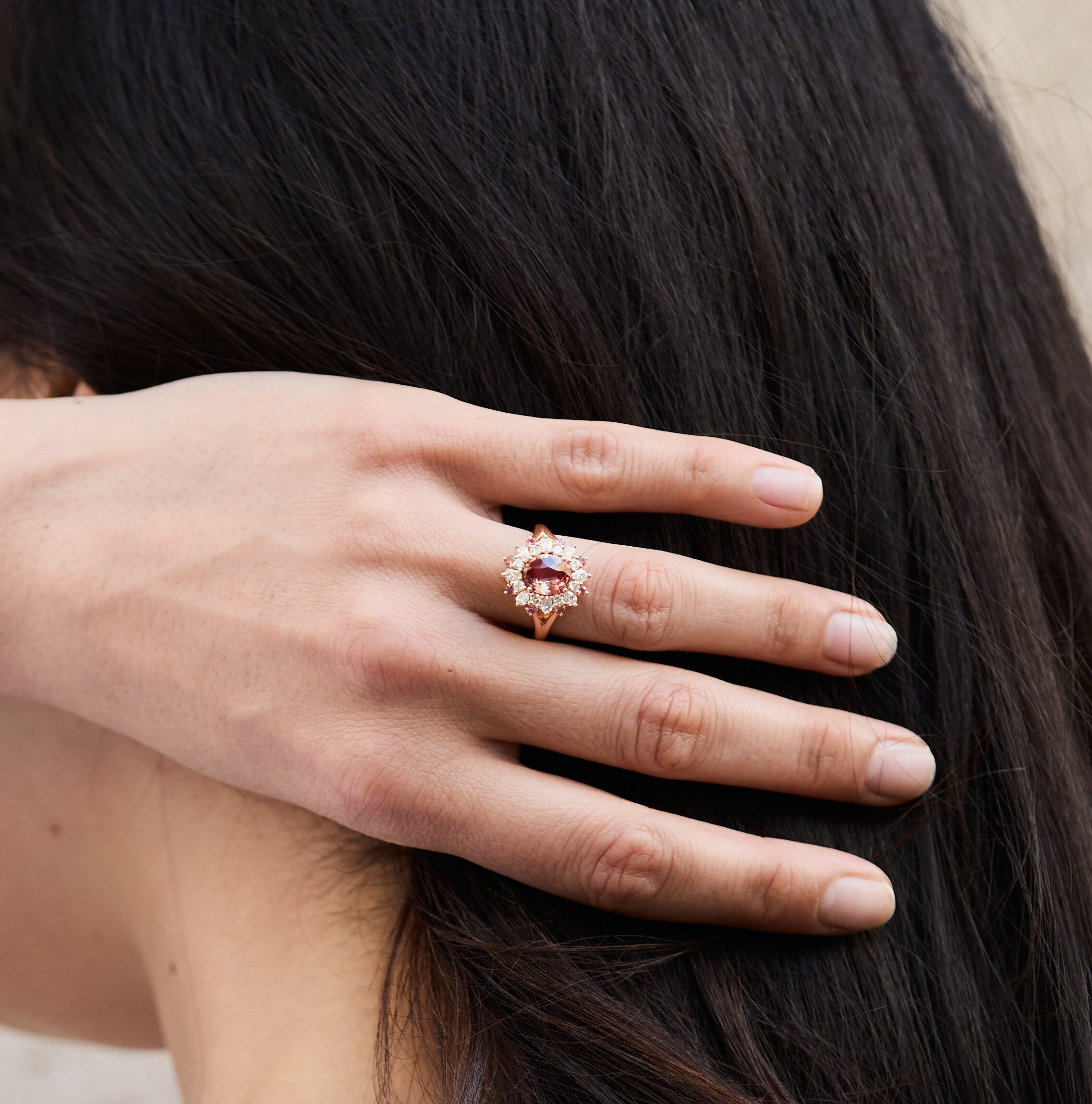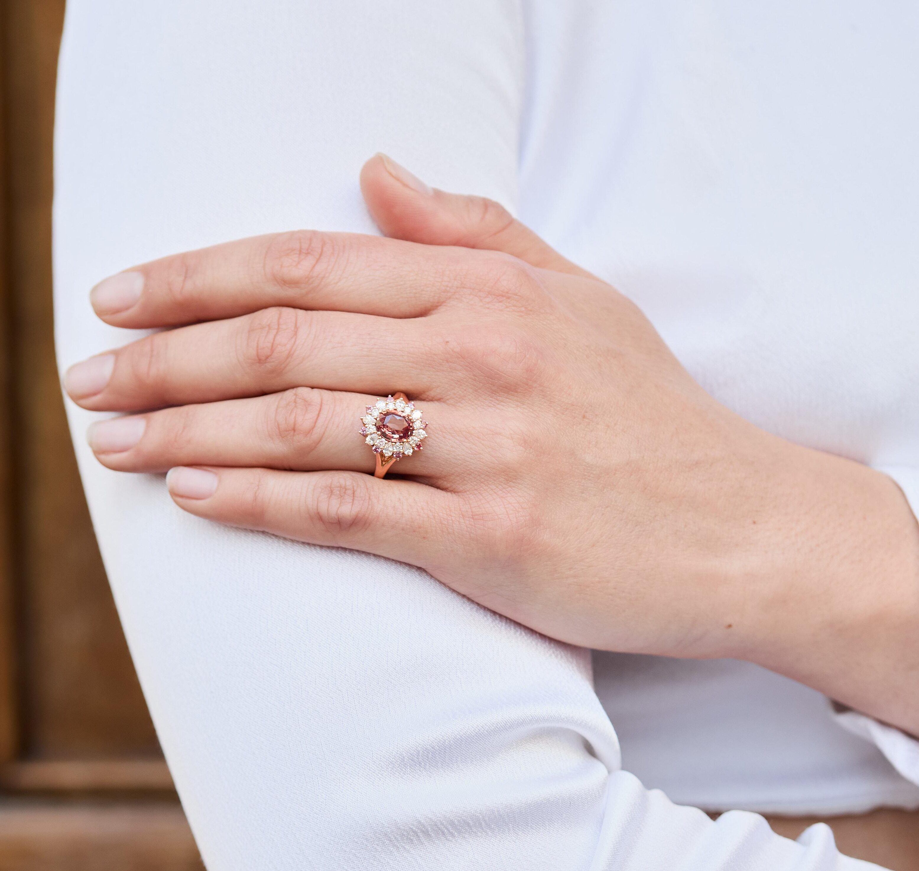 Bague Colombo en or Rose sertie d’un Saphir Padparadscha de 1.57 carats (non chauffé) de forme ovale accompagnée d’un double entourage de 12 diamants Poire FVS 3x2mm (0.53 carats) et de 12 Saphirs Padparadscha de 1.5 mm (0.14 carats)