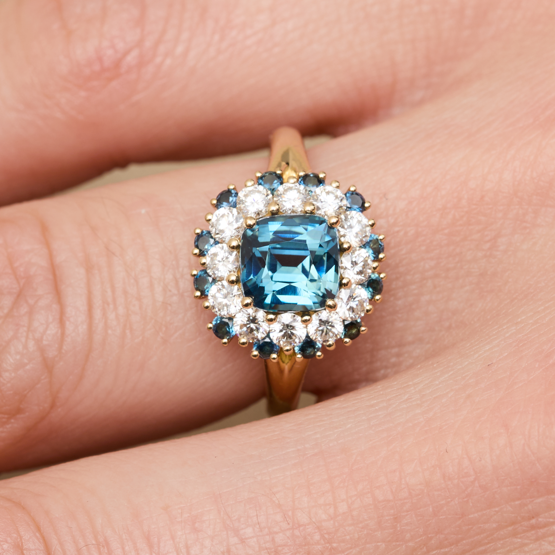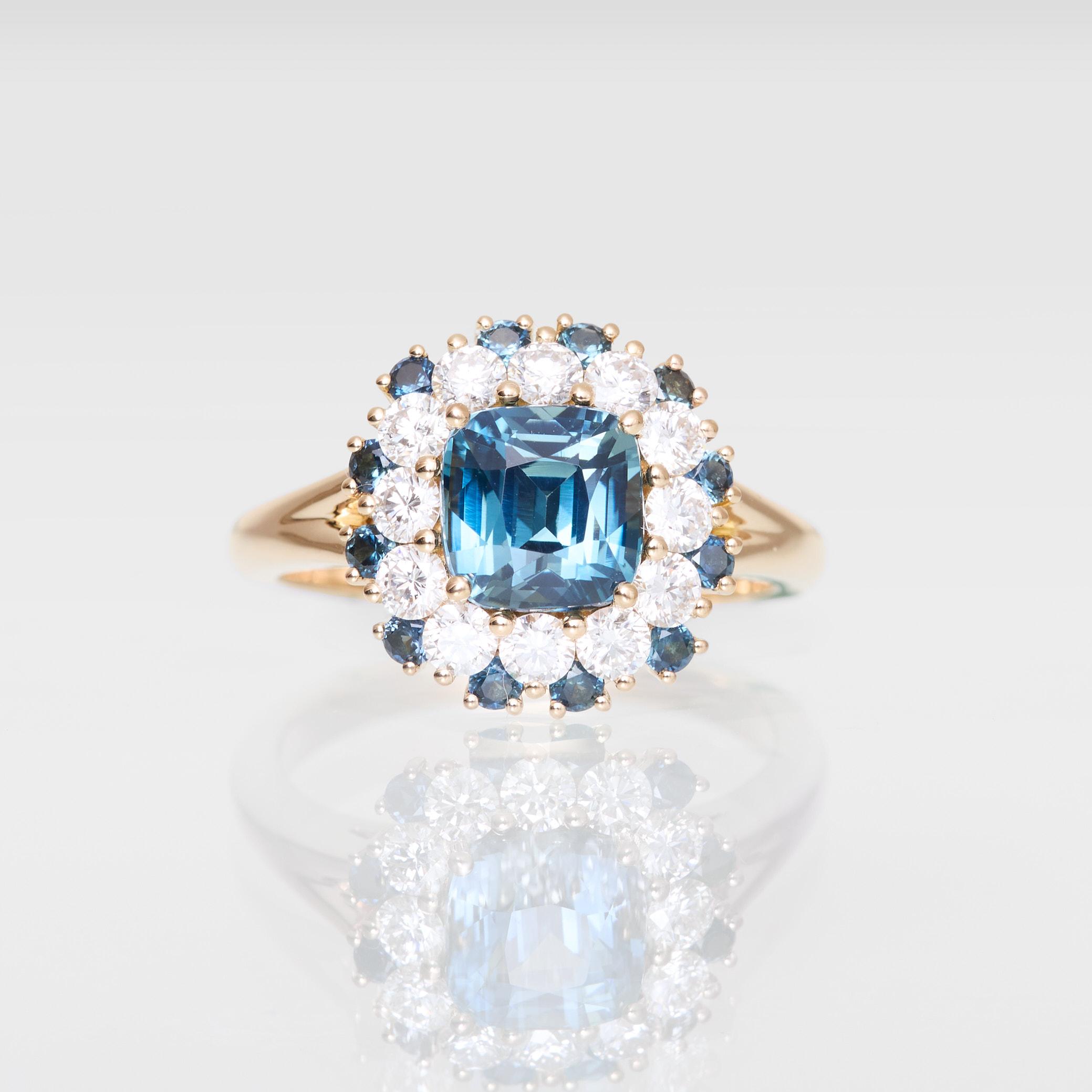• Bague Colombo en Or jaune sertie d’un Saphir Teal Indigo de 2.11 carats de forme coussin carré accompagné d’un double entourage de 12 diamants FVS de 2.4 mm (poids 0.60 carats) et de 18 Saphirs  de 1.8 mm (poids total 0.20 carats).
